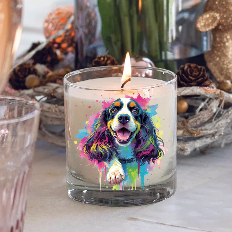 ring a touch of elegance and gentle charm to your space with our Cavalier King Charles Spaniel design candle — a loving tribute to one of the most affectionate and graceful dog breeds. Featuring a beautifully detailed water colour illustration of the Cavalier King Charles Spaniel, this candle captures the spirit of their loving, friendly nature and flowing, silky ears.